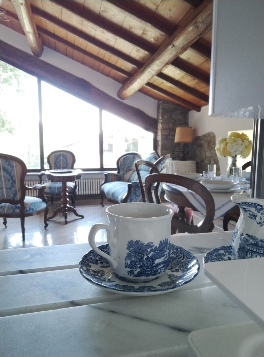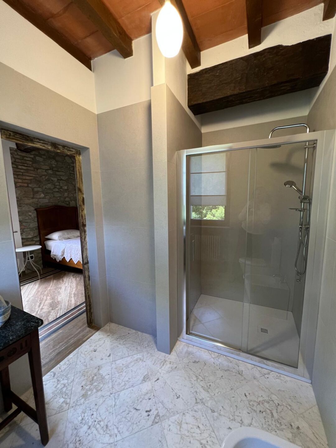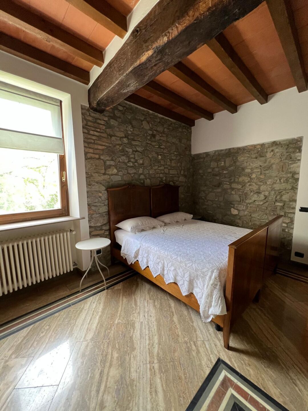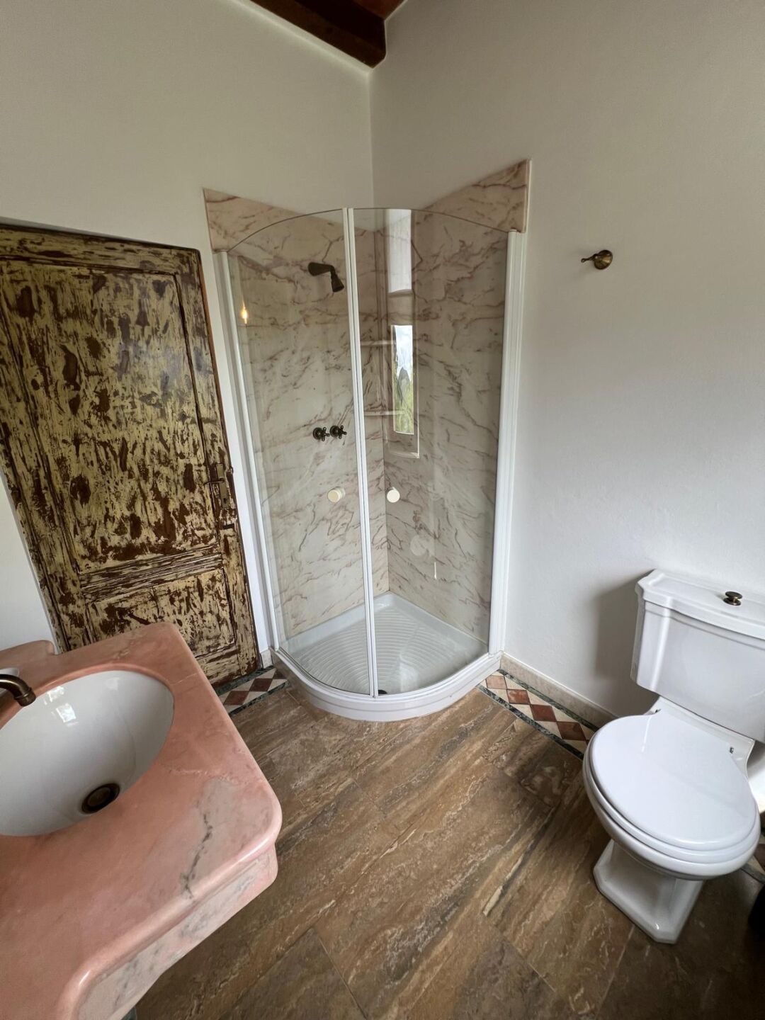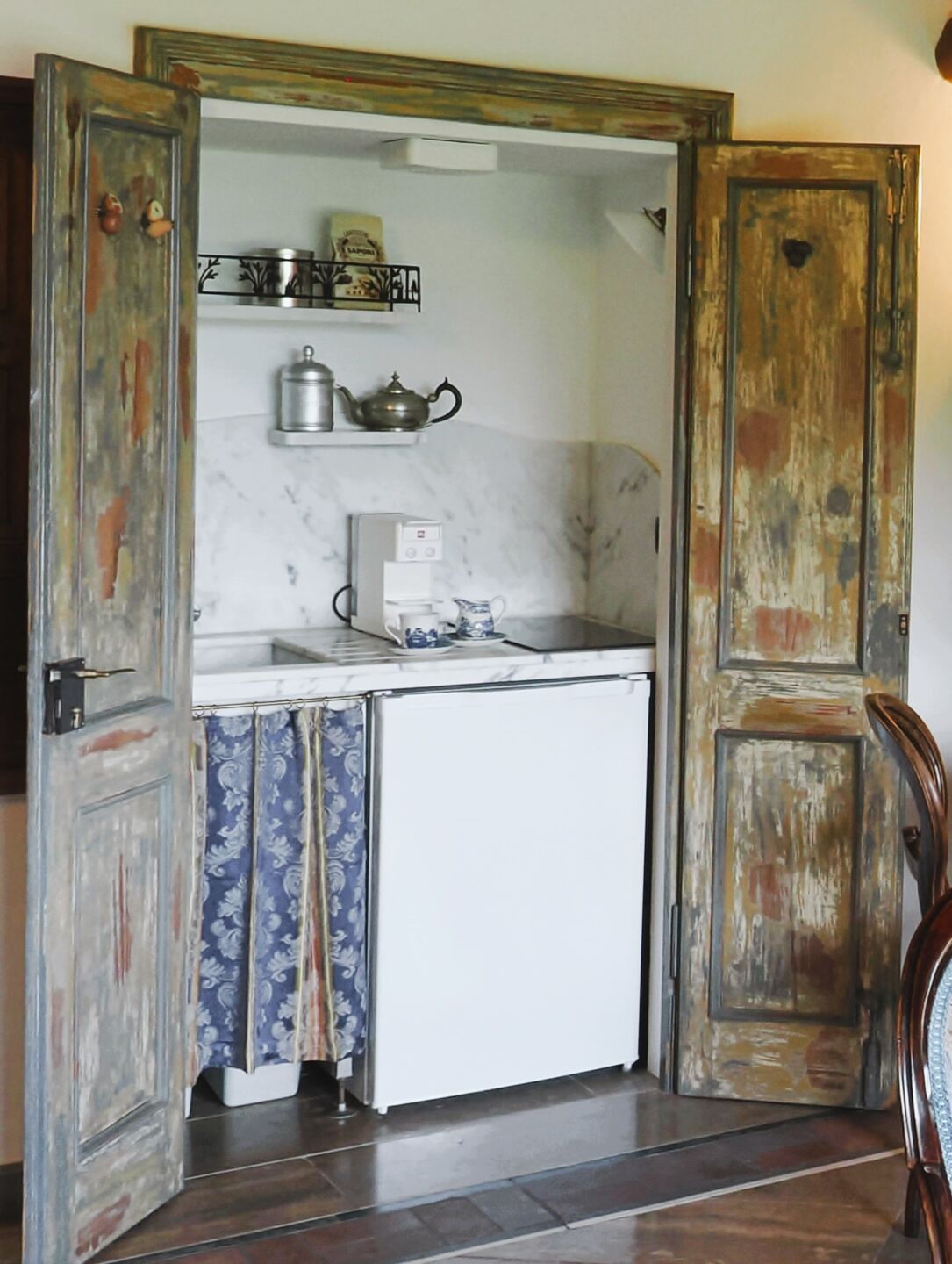 Tutti i pavimenti sono in marmo con disegni particolari e inserti in cotto, dettagli che impreziosiscono l’ambiente. Un armadio a muro nasconde un angolo cucina compatto, con lavello, piano cottura elettrico e frigo sottopiano: tutto ciò che serve per un soggiorno pratico e indipendente.