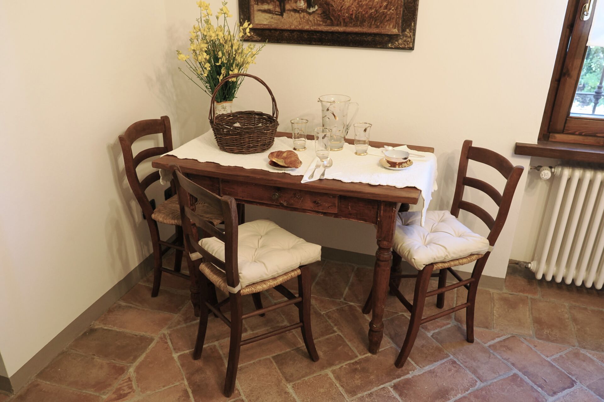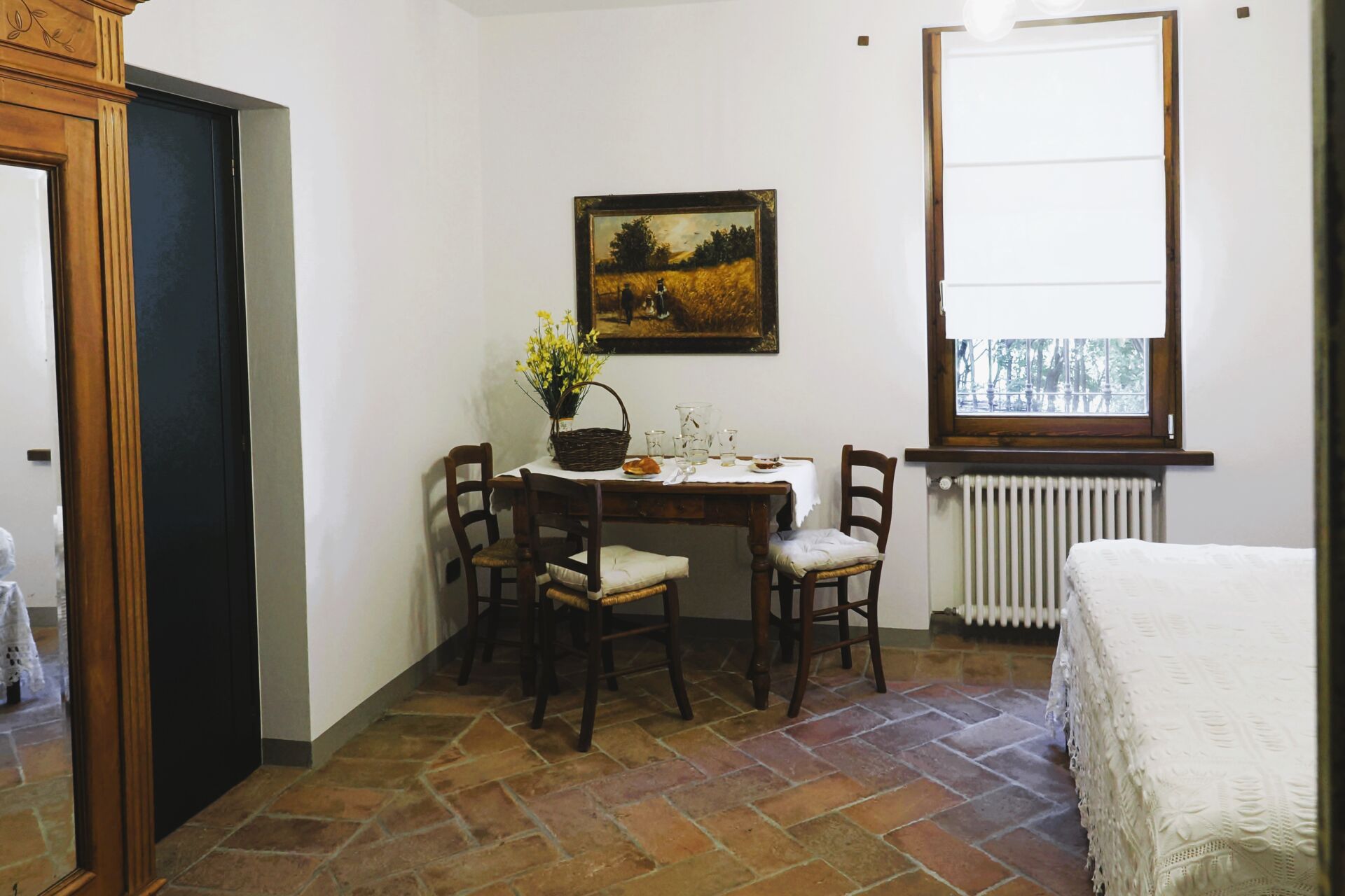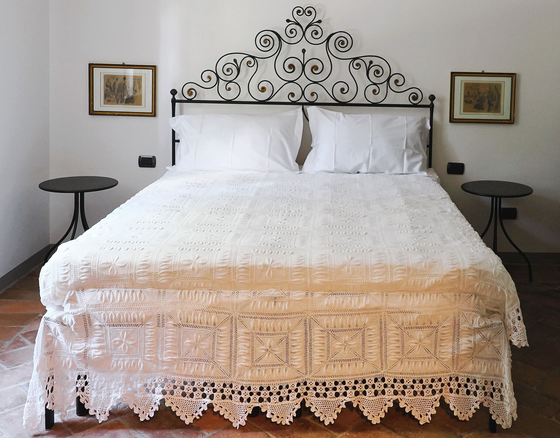 La Camera Pietra Corva accoglie gli ospiti in un ambiente di generose dimensioni, arredato con gusto e dettagli che richiamano la tradizione locale. Il letto matrimoniale in ferro battuto e le finiture raffinate rendono questo spazio perfetto per chi cerca tranquillità e charme.