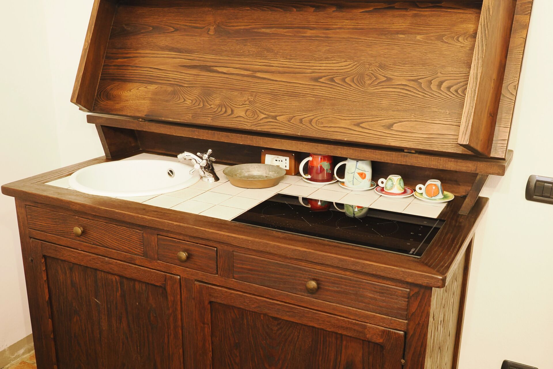 Un pratico mobile nasconde una piccola cucina attrezzata con lavello, piano cottura elettrico a due fuochi e frigobar, ideale per preparare colazioni veloci o pasti leggeri in totale autonomia.